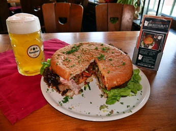 Vielfältige Fleischgerichte wie Schnitzel, Burger, Sparerips und Würste bis hin zu super guten Steaks.Auch vegetarische Speisen, frische Salatteller sowie hauseigene Spätzle über Omis hausgemachten Kartoffelsalat.